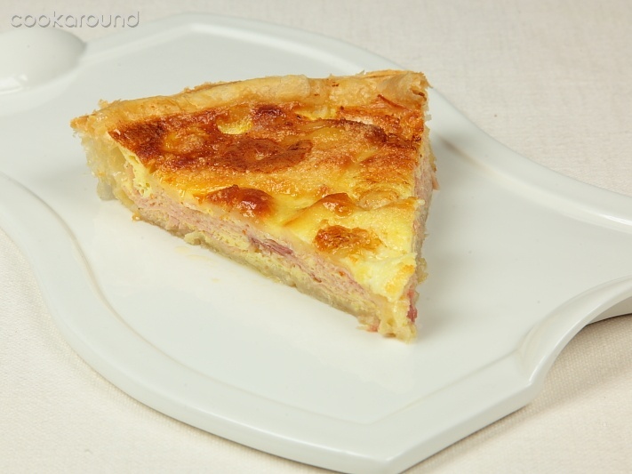 Realizzare uno strato di prosciutto sopra la base di sfoglia, distribuite il formaggio scelto sopra lo strato di prosciutto e adagiate qua e là qualche fiocchetto di burro.