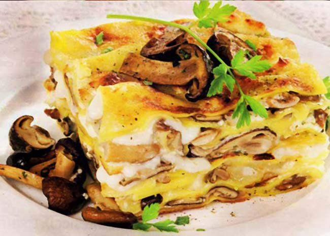 Imburrate una pirofila e velate il fondo con poca besciamella, poi fate uno strato di pasta, uno di funghi e unite qualche tocchetto di robiola. Cospargete con un po’ di parmigiano. Continuate gli strati terminando con besciamella e parmigiano.