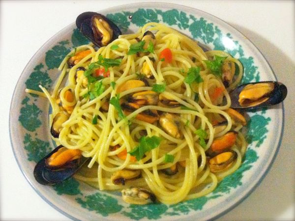 Lavate e spazzolate le cozze sotto l’acqua. Clicca qui per vedere come pulire le cozze. Fate soffriggere uno spicchio d’aglio in padella con l’olio, mettete le cozze in padella, coprite con un coperchio e cuocete fino a che le valve dei mitili non saranno aperte, poi togliete il coperchio e sfumate con il vino bianco.