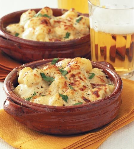 Cuoci in forno. Rosola gli scalogni tritati con il burro rimasto; irrora con il brandy e lascialo evaporare. Unisci la panna, lasciala addensare leggermente a fuoco basso e regola di sale e pepe. Versa la salsa sugli gnocchi e spolverizzali con il gruyere grattugiato. Passali sotto il grill del forno per circa 15 minuti e servi. Puoi decorare gli gnocchi, a piacere, con basilico o altre erbe aromatiche.
