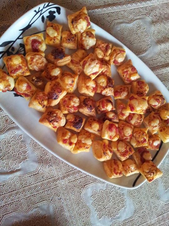 Stendere la pasta sfoglia, ricavarne dei quadretti sopra dei quali andare a mettere la salsa appena ottenuta e un pezzo di mozzarella.