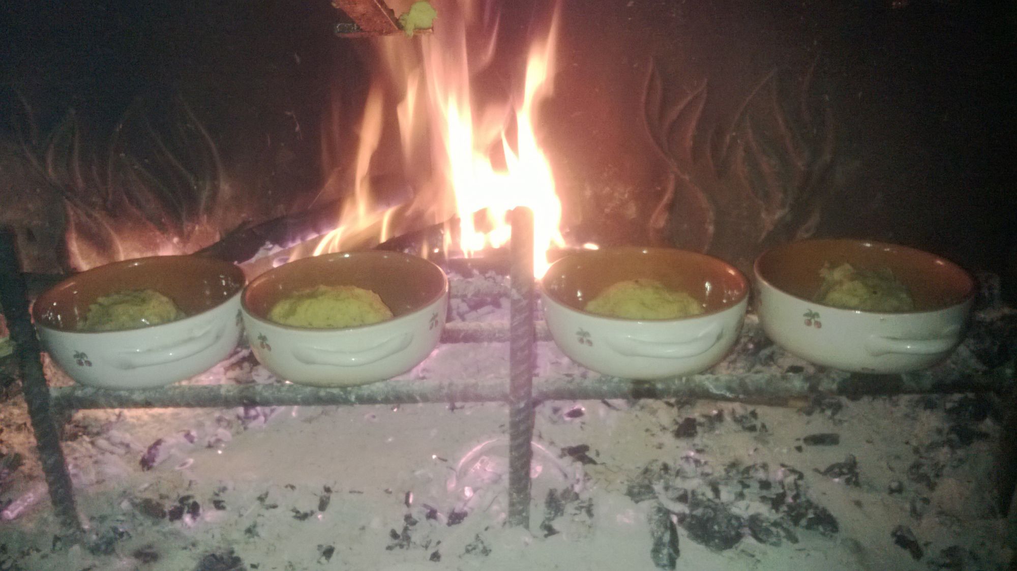 Per la polenta: in una casseruola capiente, portare a ebollizione l'acqua salata. Togliere la pentola dal fuoco e versare a pioggia la farina gialla mescolando continuamente con una frusta, cuocere fino a quando risulterà densa. Formare delle pallottole, inserire al centro il formaggio a pezzetti e chiuderle bene. Cuocere nel camino per 15-20 minuti fino a quando l'esterno sarà croccante. Servire con finocchi e carote.