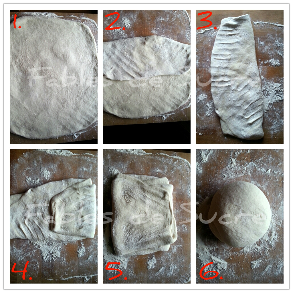 - Stendo l’impasto sul piano infarinato cercando di farne un quadrato (foto 1.), divido idealmente l’impasto in tre parti uguali, e piego le parti laterali su quella centrale sovrapponendole (foto 2. e 3.). Ora sul rettangolo ottenuto, rifaccio la stessa cosa (foto 4. e 5.), poi giro per tenere la falda della piega sotto, e arrotondo tutto (foto 6.) per poi metterlo in una ciotola unta d’olio coperta da pellicola. Lo conservo in frigorifero per 24 ore, se posso, ma se i tempi non me lo permettono la tengo anche meno. Comunque preparo sempre il giorno prima per cuocere il successivo.