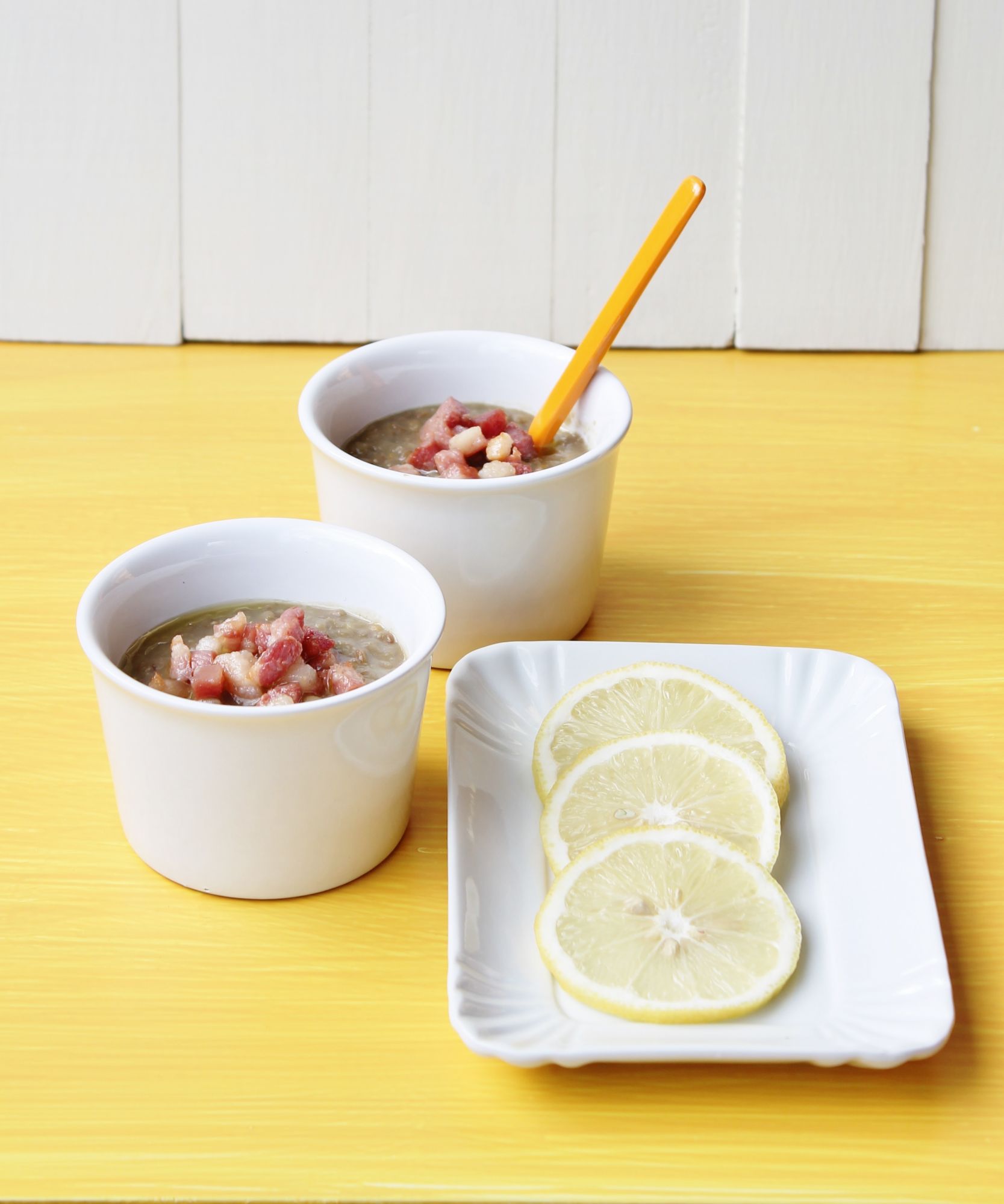 Una zuppa di stagione con lenticchie, limone e pancetta, da servire calda con crostini di pane