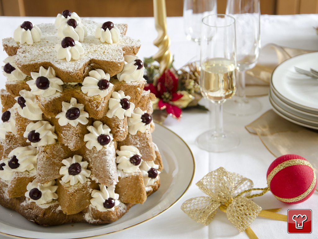 Tagliate il pandoro nel senso della larghezza e ricavate delle fette con la classica forma di stella spesse circa 3 cm.