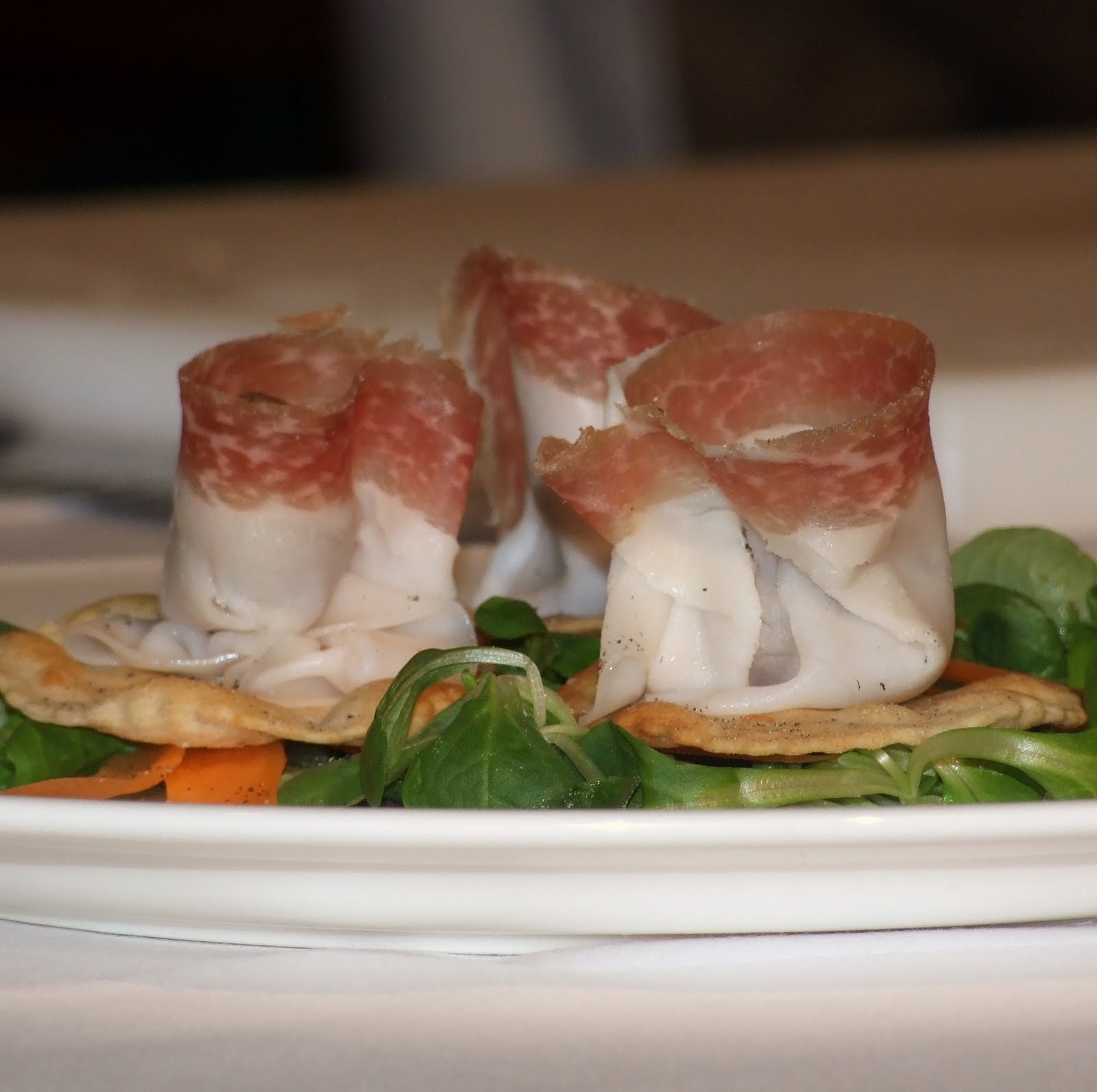 Ricoprire i quadratini con le fette di lardo, mettere 3 aghi di rosmarino su ognunqual è far colare sopra del miele.