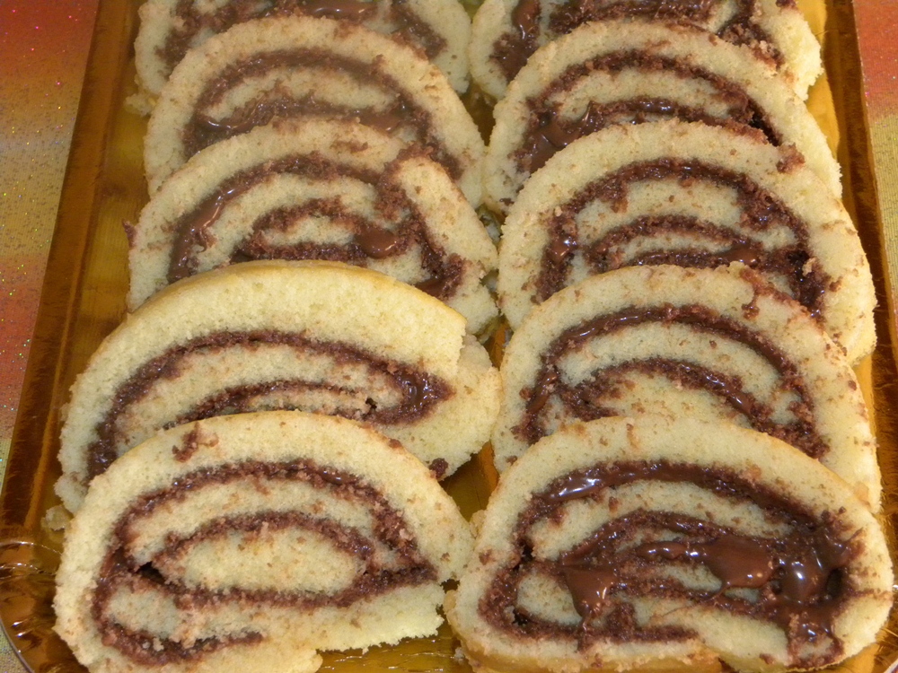 Tagliatela a metà, in 2 rettangoli di circa 30X20, e coprite ogni parte con della carta da forno bagnata e strizzata. Arrotolate ciascun rettangolo, deve essere molto stretto, e fateli raffreddare. Srotolate la pasta e togliete la carta da forno superiore, quindi spalmate la parte bianca con la nutella e arrotolate di nuovo.