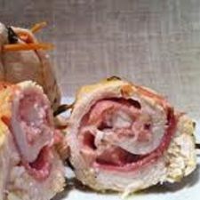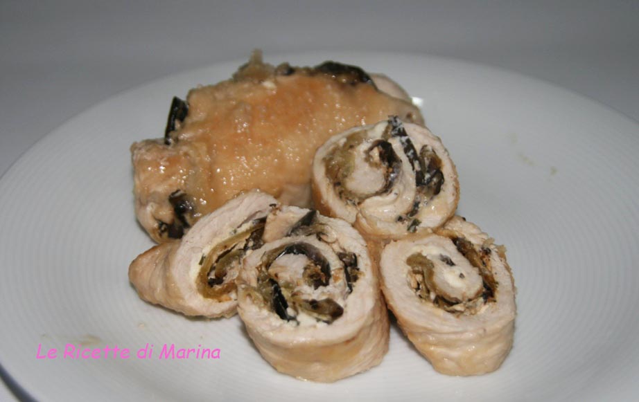 Spuntate una melanzana, tagliatela a fette longitudinali sottili e grigliatela da entrambe i lati. Battete le fettine di carne su un tagliere e ricoprite con una fetta di melanzana ed una di formaggio