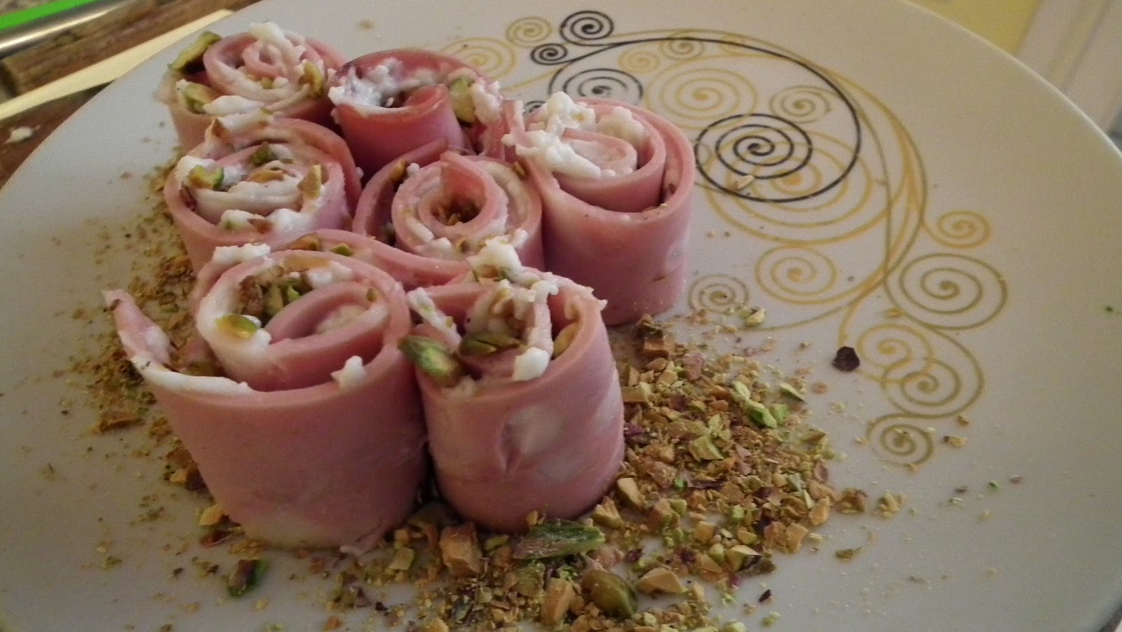 Spalmare su ogni fetta e spolverizzare con pistacchi arrotolare e servire come fosse un sushi.