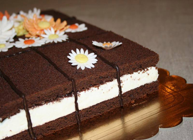 Dividere a metà la torta al cacao e farcirla con la crema bianca.