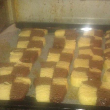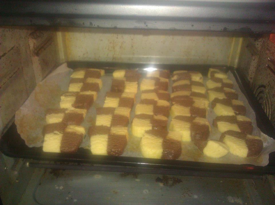 Tagliare i bastoncini uguali per spessore (1cm) e numero. Spennellate i bastoncini con l'albume sbattuto e sovrapponete 2 bianchi e 2 neri alternandoli.