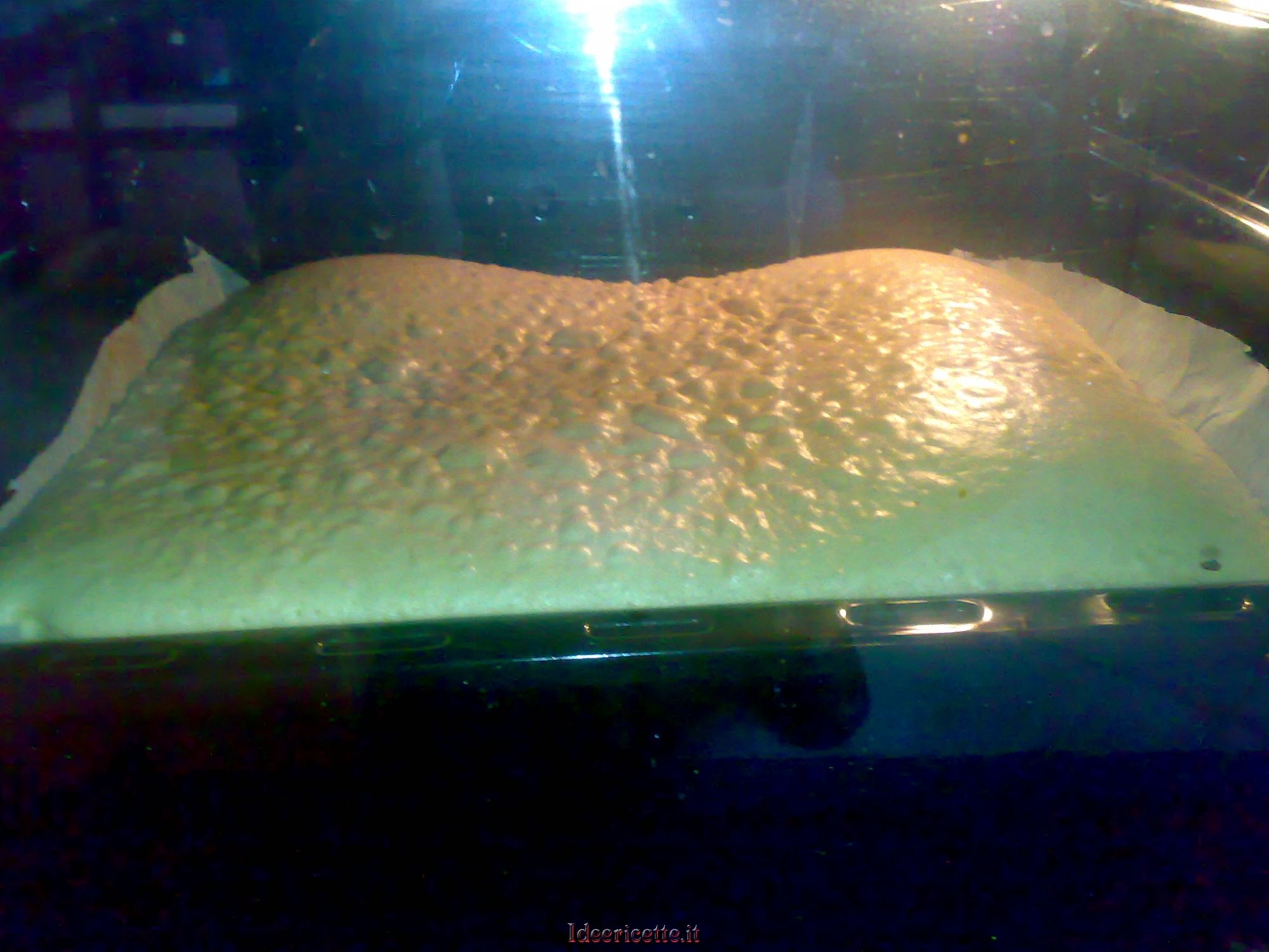 Versare il composto in una placca da forno (per ottenere una base rettangolare, ideale per fare un rotolo) o in una teglia rotonda, ricoperta da carta forno.