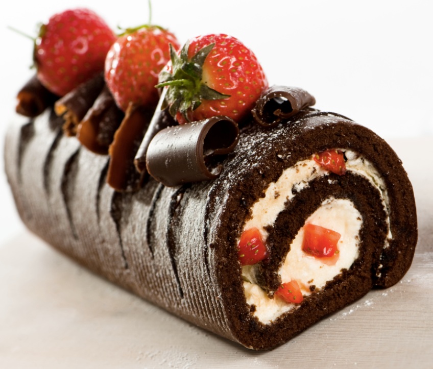 Nel frattempo montare la panna con lo zucchero a velo e tagliate delle fragole a pezzettini. Stendete la panna e le fragole sulla pasta uniformemente, arrotolatela nuovamente su se stessa e adagiate il rotolo così ottenuto su una griglia