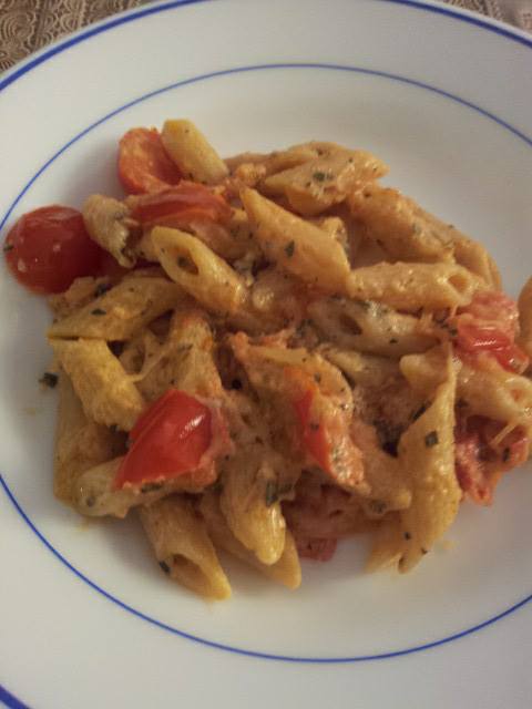 Penne integrali con pomodorini, erbe aromatiche e Philadelphia