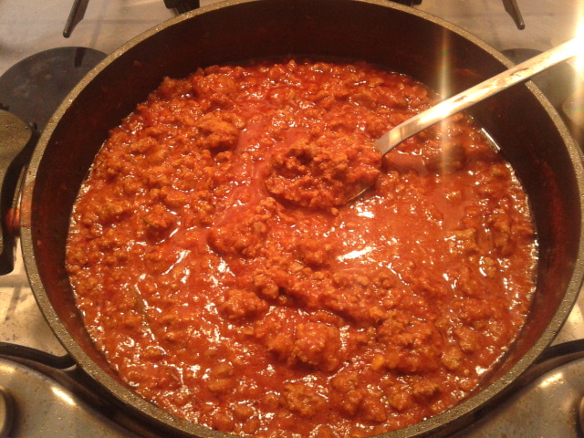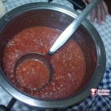 Versare la salsa di pomodoro e far bollire a fuoco basso per 3 ore girando e all'occorrenza aggiungere il brodo di carne (non il dado) o l'acqua calda giro giro ai bordi.