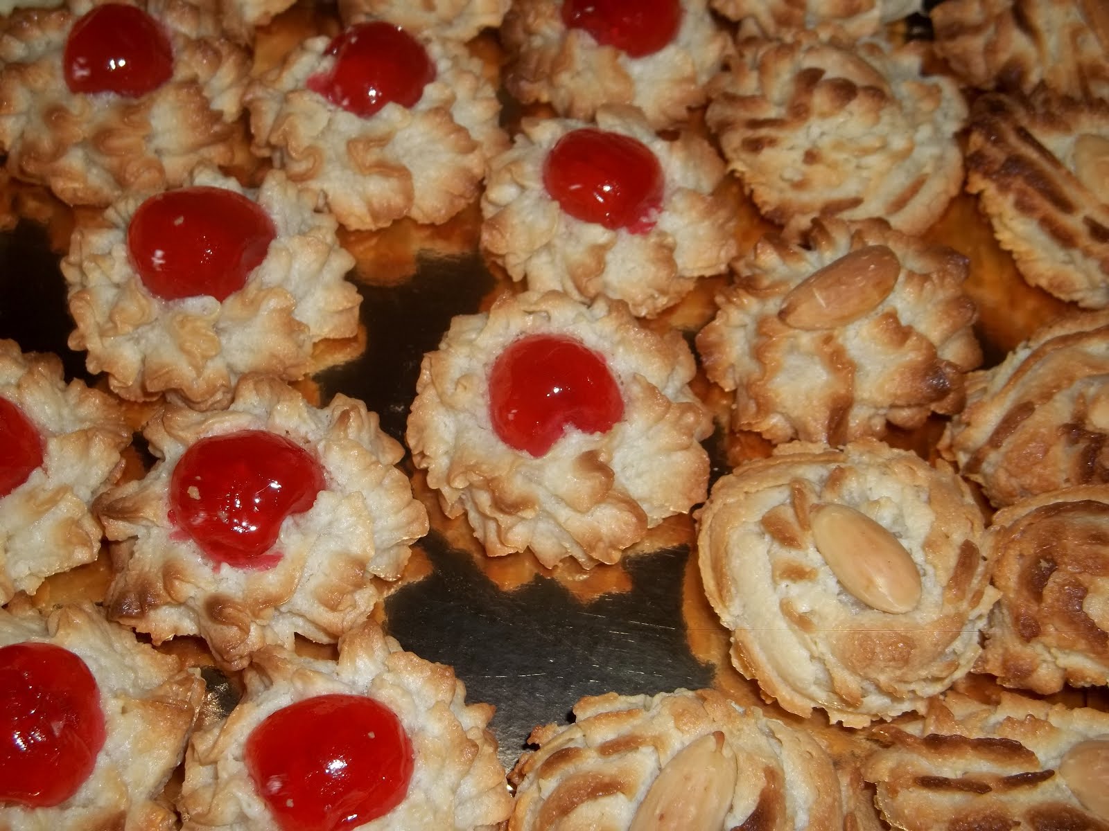 Decorate ogni dolcino con le ciliegie candite tagliate a metà e con le mandorle sgusciate.