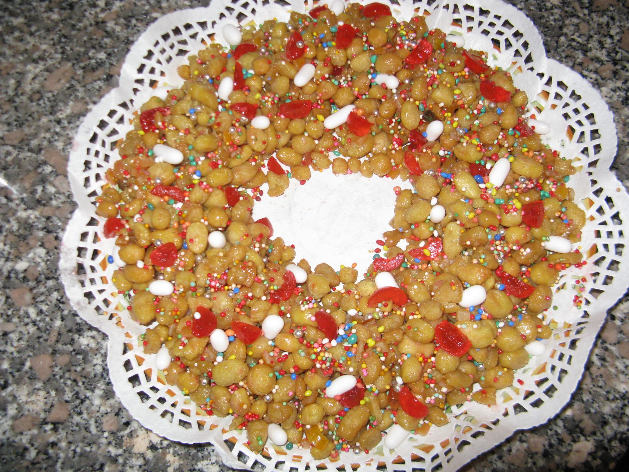 Infine mettete gli stuffoli in un bel vassoio ovale e cospargete con i diavoletti.