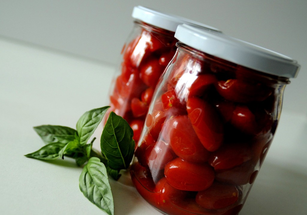 Riempire i vasi pressando appena ed aromatizzare con foglie di basilico e peperoncino.