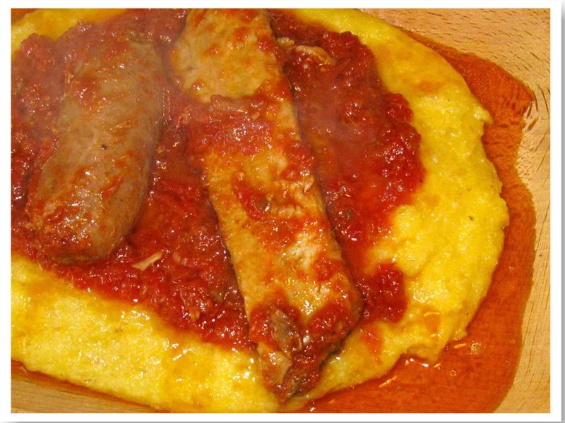 Appoggiate su un vassoio la polenta cotta e versare il sugo bollente sulla polenta e disporre le salsicce sul piatto di portata;