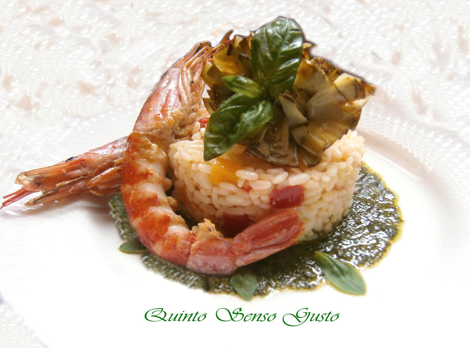 - 250 g. di riso carnaroli, 6 falde di peperoni sott'olio grigliati, 4 carciofi sott'olio, olio evo (io) biologico Tripodi q.b. sale q.b. 12 gamberoni reali, pesto di basilico,1 bicchierino di brandy.