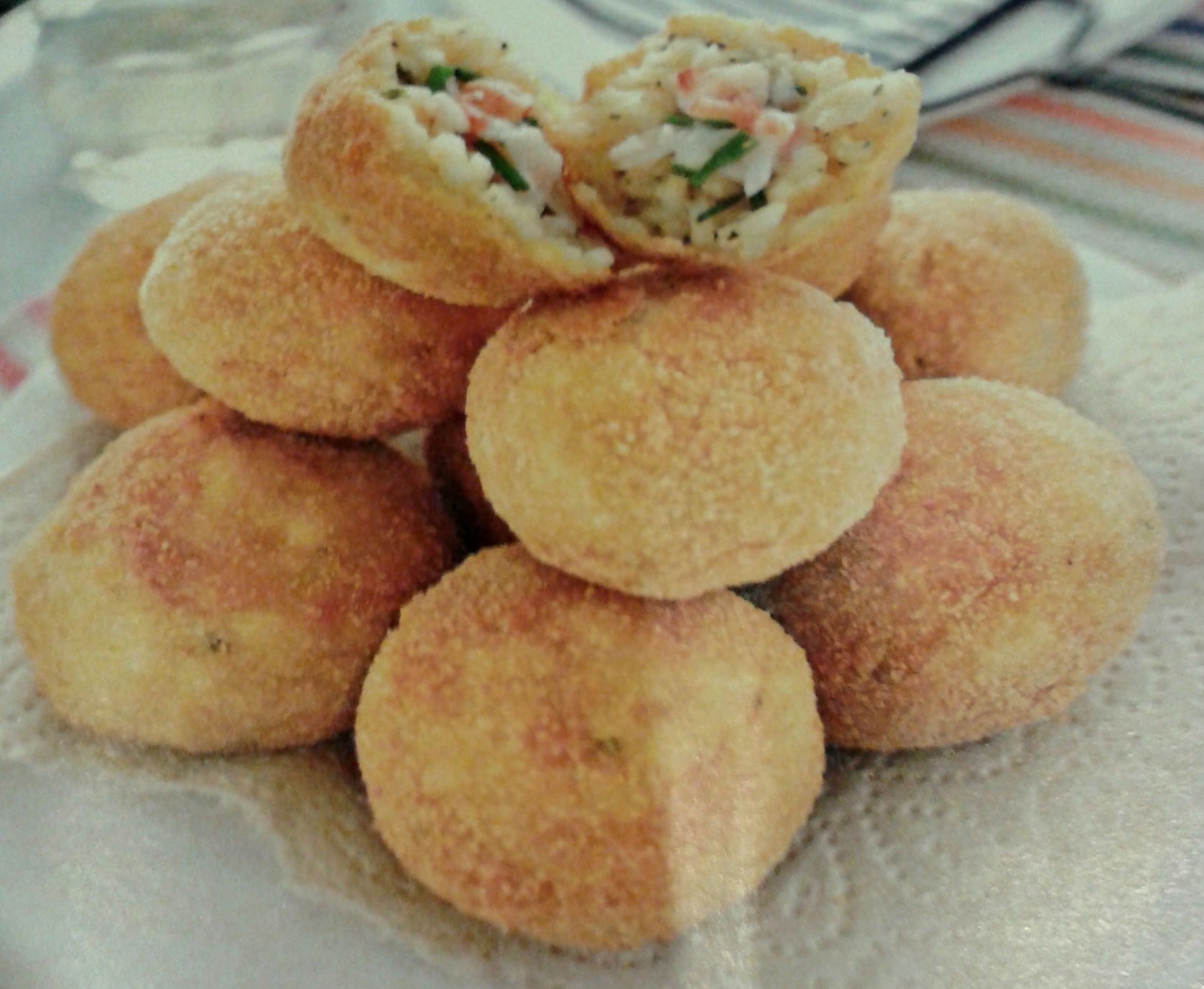 Sgusciare i gamberi ed eliminare il filetto nero.Tostare i gusci con un filo d' olio a fuoco medio, schiacciandoli con una forchetta. Sfumare con 1dl di vino e versare il brodo freddo, portare lentamente ad ebollizione e cuocere per 15 minuti. Filtrare e riportare a bollore. Rosolare la cipolla tritata con 20gr di burro. Tostare a parte il riso senza aggiungere grassi e unire alla cipolla, sfumare con 1dl di vino e due mestoli di brodo, mescolare. Cuocere per 16 minuti, unendo poco brodo caldo quando il precedente evapora e mescola ad ogni aggiunta. Regolare di sale e pepe, mantecare incorporando 50gr di caprino e insaporire con un cucchiaio di prezzemolo. Fai raffreddare. Scaldare poco olio e scottare i gamberi per un minuto. Sgocciolarli, tagliarli a pezzettini e mescolarli al caprino rimasto, poca erba cipollina, la scorza di limone grattugiata, sale e pepe. Con il riso formare tante palline con un incavo al centro, farcire con poco composto di gamberi e caprino. Richiudere e compattare bene. Sbattere le uova con poco sale e pepe. Passare gli arancini prima nella farina, poi nelle uova e quindi nel pangrattato. Scaldare abbondante olio di semi e friggere pochi arancini alla volta per 3-4 minuti, girandoli a metà cottura. Sgocciolare e servire subito.