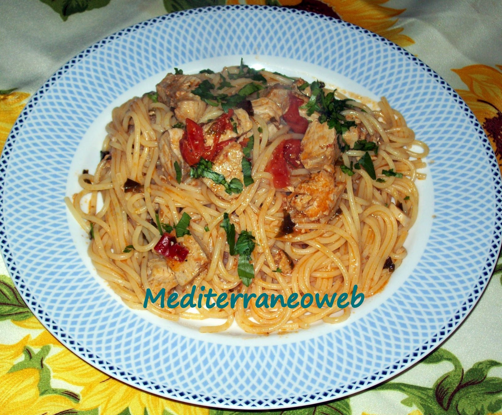 Spelliamo i pomodorini al solito modo, (sbollentandoli per 1 minuto in acqua bollente) e teniamoli da parte. Prepariamo il pesce spada nel seguente modo: in un padellino con un filo d'olio lasciamo rosolare la fetta un minuto per parte, in questo modo la pelle intorno si staccherà dalla carne, cosi sarà più semplice l'operazione di pulizia, controlliamo pure che non vi siano spine, quindi tagliate a dadini e tenete da parte. In una padella salta pasta fate rosolare con 4 cucchiai di olio d'oliva 2/3 spicchi di aglio sminuzzato e 1 peperoncino anch'esso spezzettato, aggiungete il pesce spada lasciate insaporire un paio di minuti, adesso alzate la fiamma e unite mezzo bicchiere di vino bianco, lasciate sfumare per un minuto e riabbassate la fiamma, versate i pomodorini spezzettati e a fiamma moderata lasciate cuocere per 10 minuti. Scolate gli spaghetti al dente versateli nella padella e fate saltare e amalgamare per 5 minuti affinchè il sughetto si assorba nella pasta, unite una manciata di prezzemolo tritato, servite ben caldi e.......buon appetito.