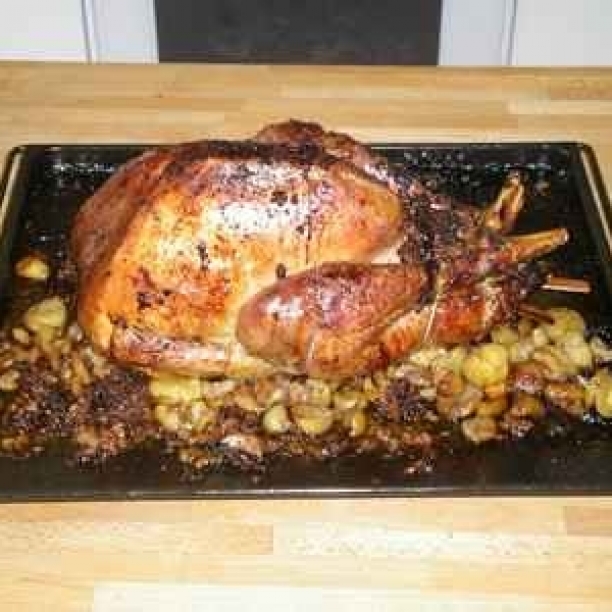 Far cuocere il tacchino 2 ore e mezza. Bagnare spesso il tacchino con il proprio succo durante la cottura.