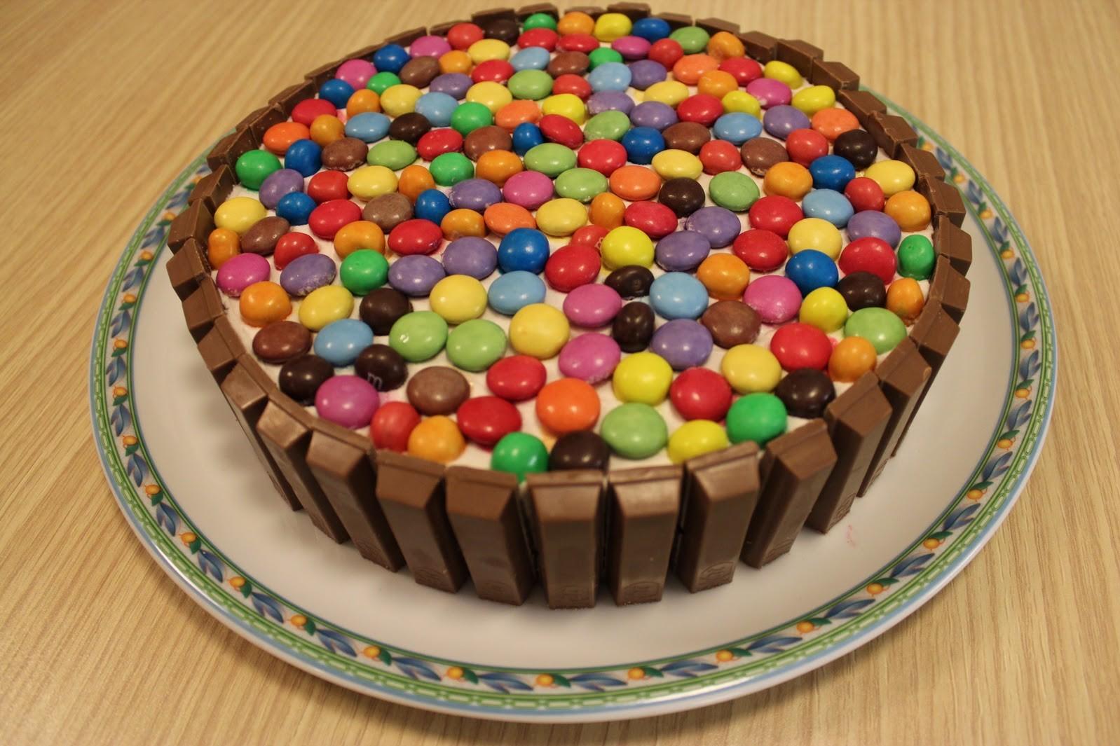 Decorate la torta kit kat con un fiocco e cospargete la superficie con gli m&m’s quindi mettete in frigo per un’ora prima di servirla