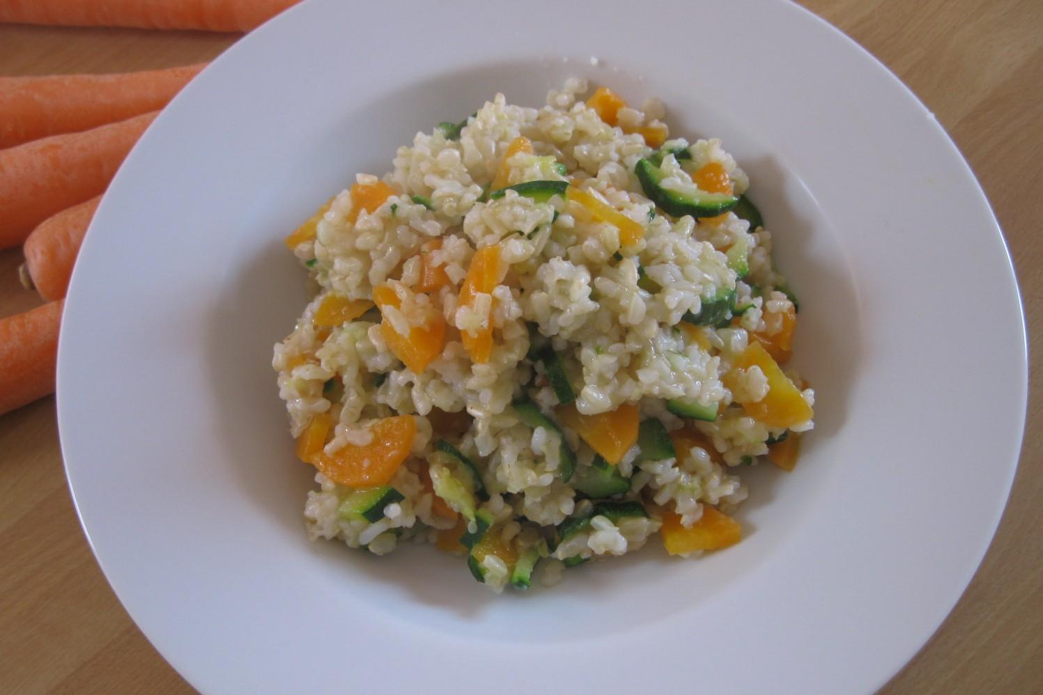 Unire le verdure e portare a cottura il riso, mescolando con precauzione con un cucchiaio di legno per non schiacciarle eccessivamente.