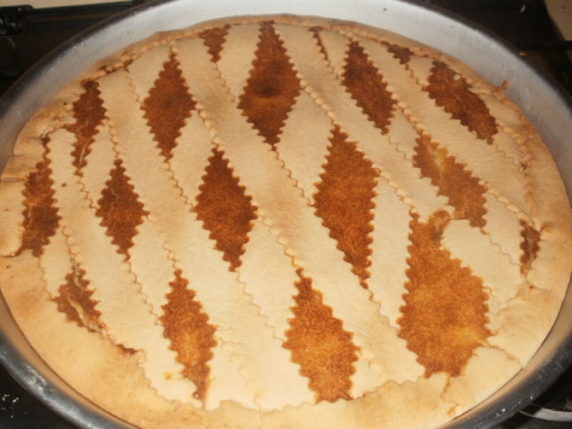 a questo punto foderare conuna parte della pasta frolla una teglia imburrata,versare l'impasto e con la pasta frolla rimasta creare delle striscioline.