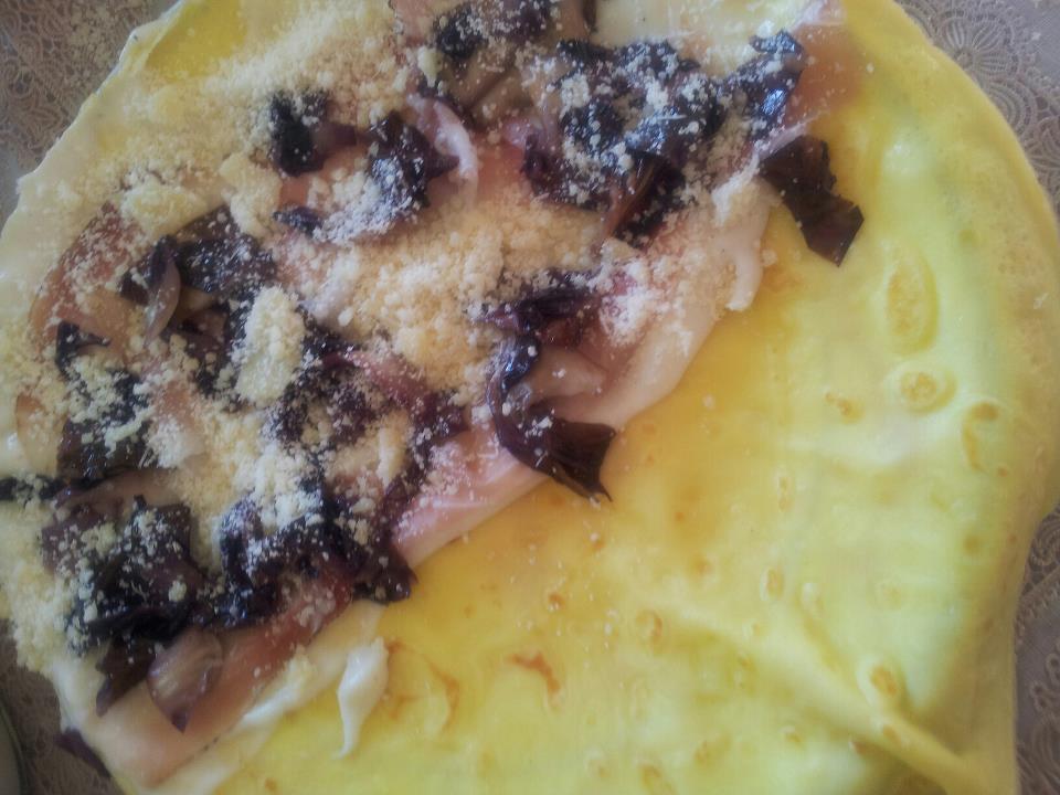 farcire ciascuna crespella con un leggero strato di besciamella, del radicchio, qualche fetta di speck e del formaggio grattugiato.