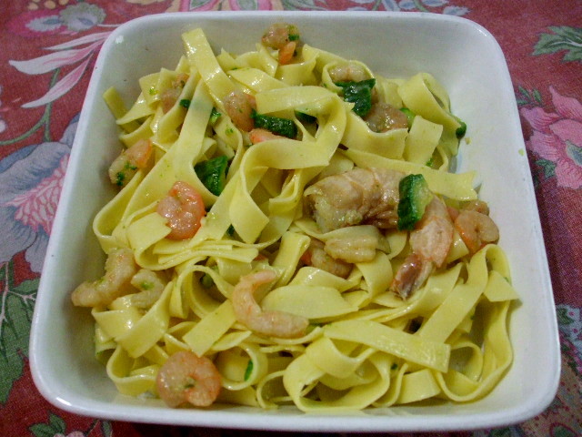 Nel frattempo cuocere al dente le fettuccine, scolarle e farle saltare insieme nel tegame con gli altri ingredienti.