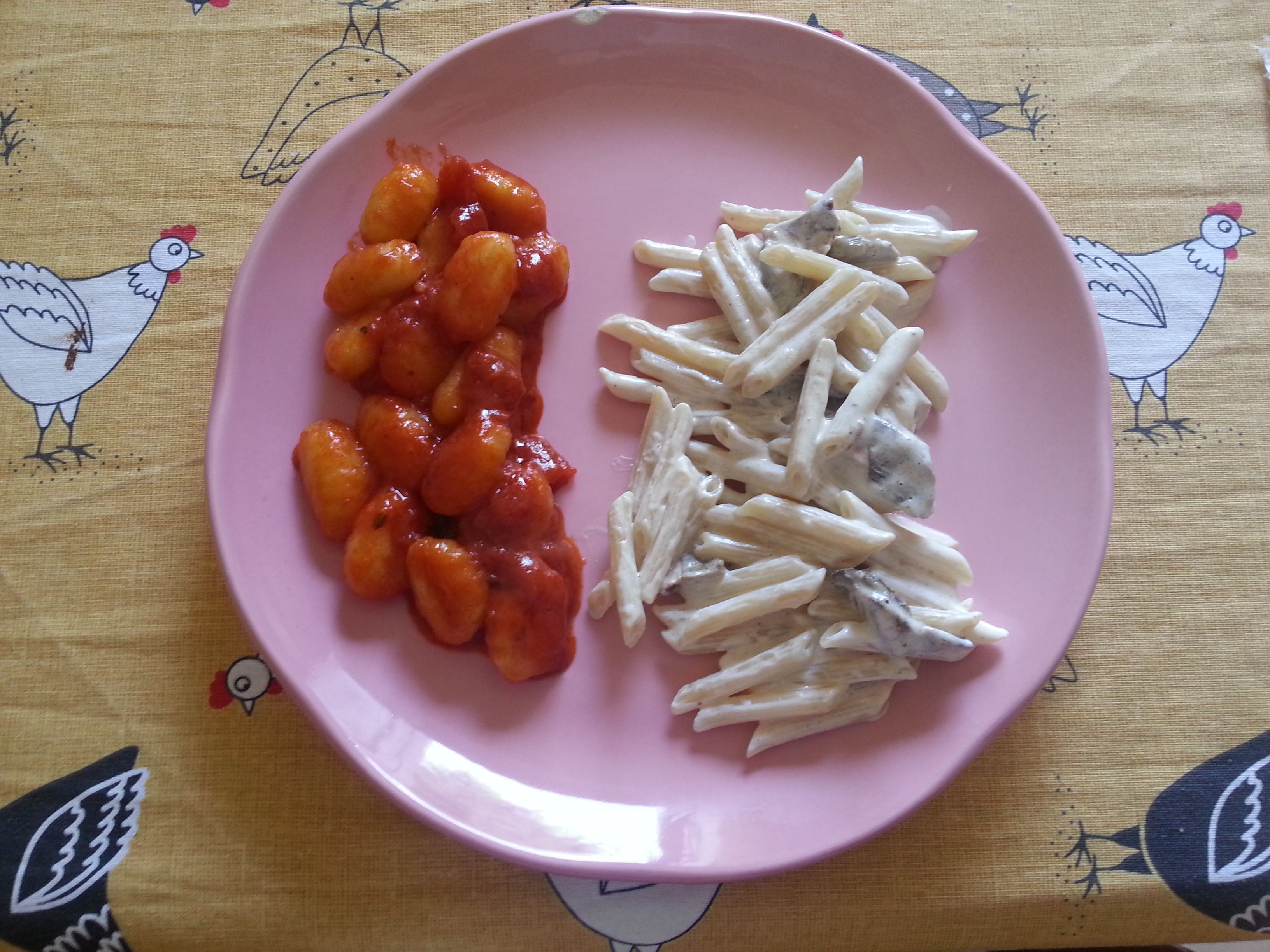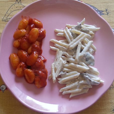 A questo punto la pasta e gli gnocchi dovrebbero raggiungere il punto di cottura nello stesso momento. Scolate e condite la pasta con i funghi e la panna con un pizzico di pepe, poi gli gnocchi col vostro sugo di pomodorini.