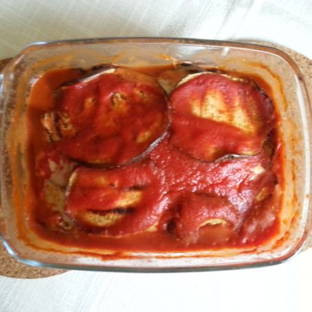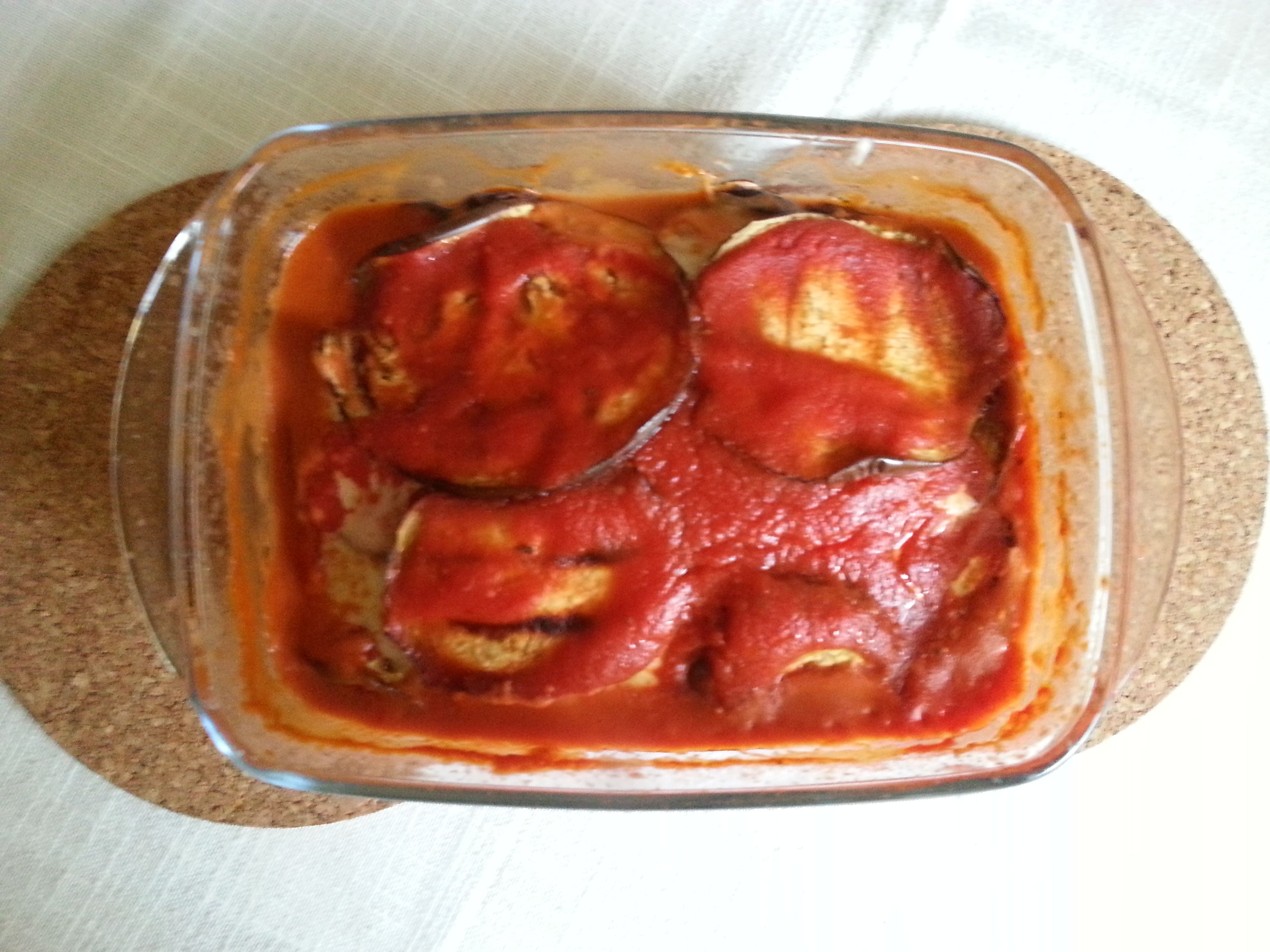 Salare le melanzane e stenderle in una terrina a strati alterni di: melanzane, sugo, formaggi.