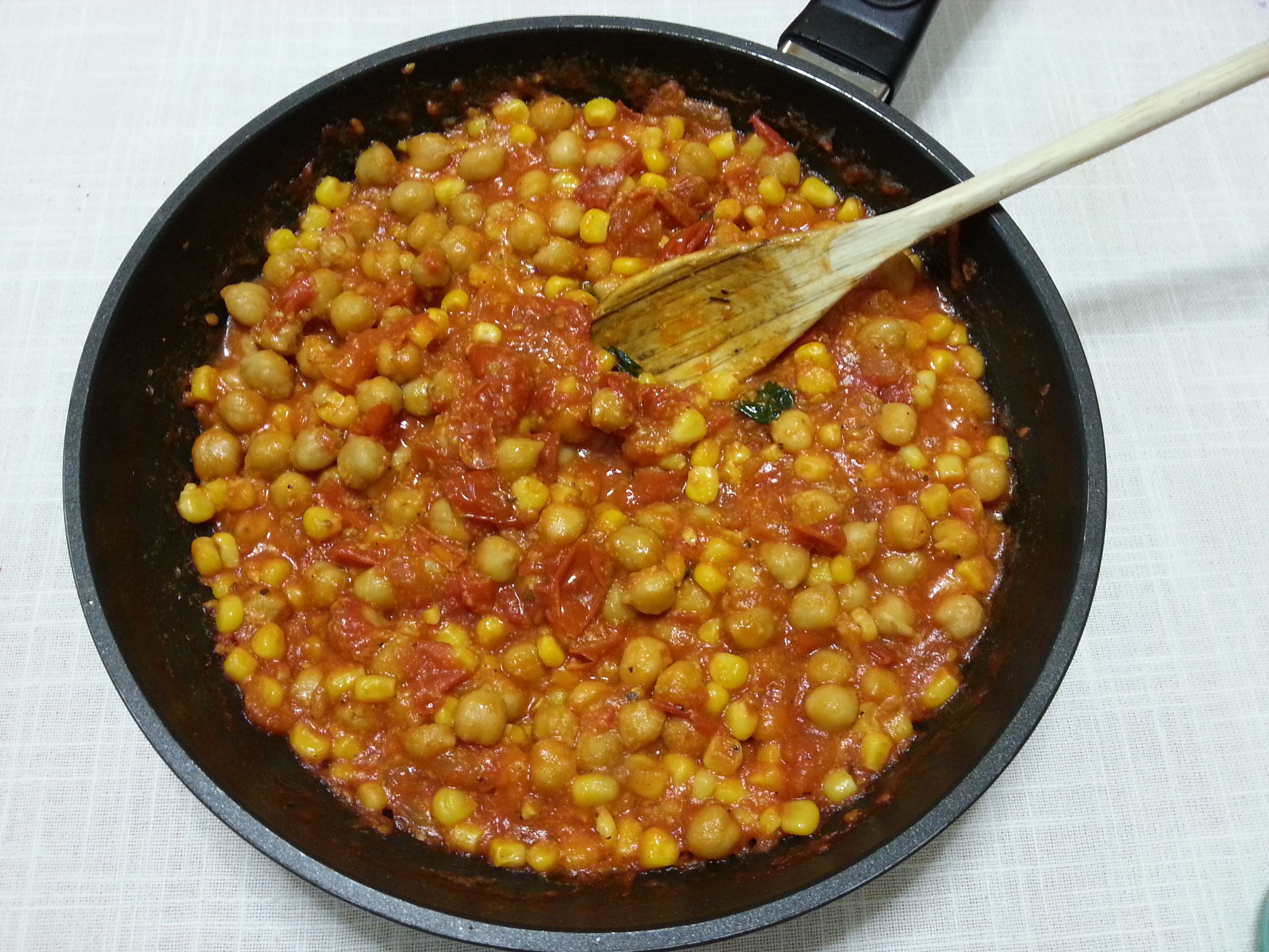 Aggiungere il pomodoro tagliato a pezzettini, dopo qualche minuto il mais, il basilico e i pomodorini secchi. Una spruzzata di ketchup per amalgamare il tutto, la passata di pomodoro e i peperoni.