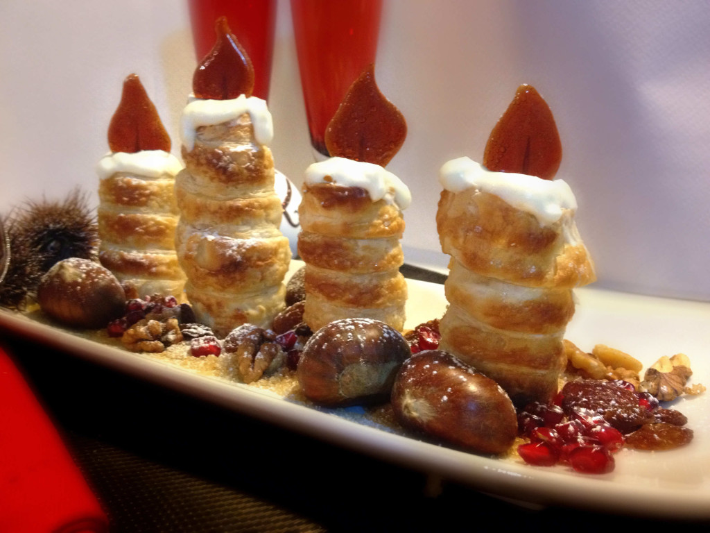 Simpaticissimi cannoli di pasta sfoglia, farciti con ganache al cioccolato bianco e decorati come fossero candele.