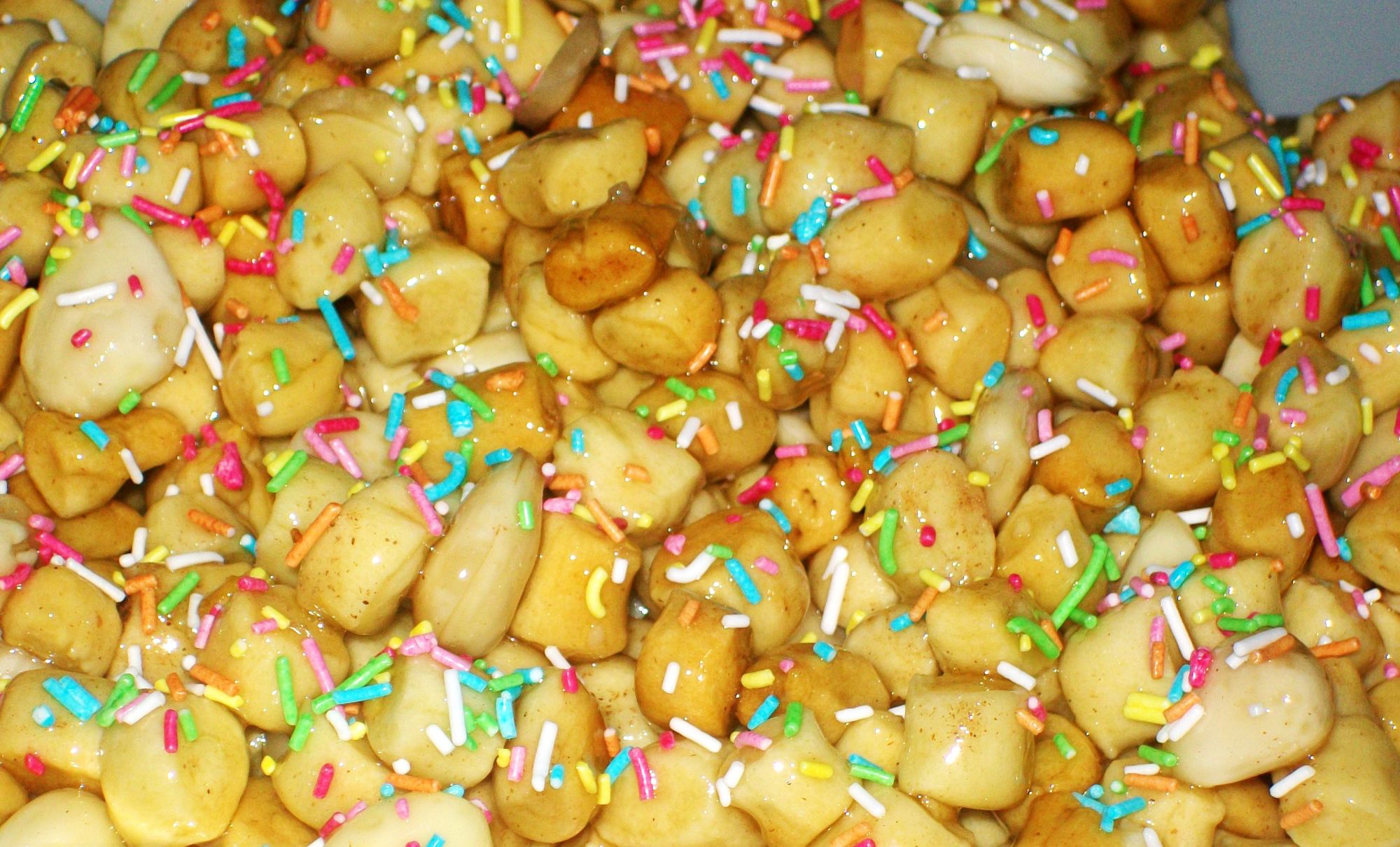Quando tutte le palline saranno fritte, riscaldare il miele in una casseruola, versare le palline e mescolare, perché tutte se ne impregnino.