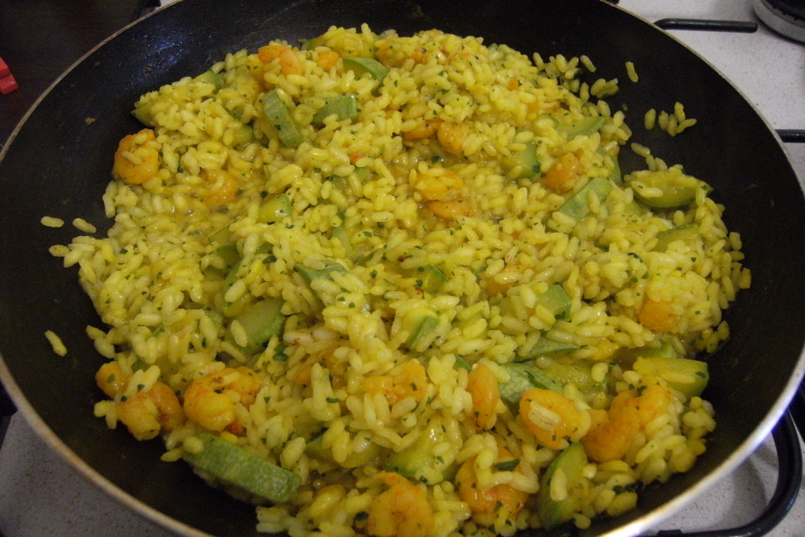 Sbollentate in acqua bollente salata i gamberetti per circa 10 minuti,scolarli bene.Nella stessa acqua,sbollentate anche la zucchina già tagliata a fette per soli tre minuti.Tritare la cipolla. Far fondere in una casseruola una noce di burro e rosolarvi la cipolla. Unire il riso e lasciarlo tostare fino a quando i chicchi iniziano a traspirare.Sfumare con vino bianco, minimo un bicchiere. Quando tutto sarà asciugato, versare il brodo, un mestolo alla volta.