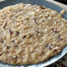 Quando il riso è quasi cotto aggiungi il radicchio e completa la cottura. Al termine aggiungi scamorza in piccole parti e formaggio grattuggiato e amalgama bene.