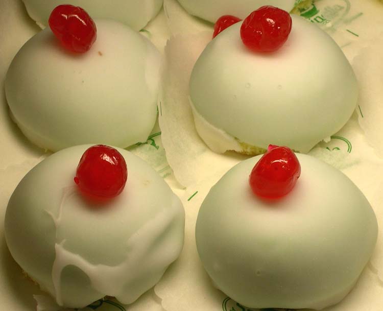 Riprendere dal frigorifero la palla dell’impasto e stenderla sottile su di un ripiano aiutandosi con un matterello, ricavare poi dei dischi delle dimensioni giuste per foderare gli stampi a disposizione per ottenere le minne di vergine. I dischi di pasta andranno a foderare gli stampi già spennellati di strutto e spolverizzati di farina. Riempire la cavità di crema di ricotta precedentemente ottenuta. Con degli altri dischi di pasta, più piccoli, ricoprire gli stampi e fare attenzione che il contenuto non fuoriesca. Capovolgere gli stampi e infornare in forno preriscaldato a 170° per circa 35 minuti. Trascorso il tempo il tempo di cottura sformare le minne di vergine e lasciarle raffreddare su di una griglia. Preparare la glassa scaldando un cucchiaio d’acqua ed il succo di limone. Unire lo zucchero a velo aiutandosi con un colino in modo che non si formino grumi, togliere il pentolino dal fuoco e rimescolare bene. Far raffreddare, unire l’abume e montare con fruste elettriche fino ad ottenre un impasto molto spumoso (se occorre usare anche 2 albumi). mentre le cupolette si saranno raffreddate versare la glassa sopra le cupole facendo attenzione che si ricoprano tutte. Recuperare la glassa che cola via dalle cupolette e ripetere l’operazione più volte finchè saranno bianchissime. Decorare ognuna con una ciliegina rossa candita. Lasciare solidificare per 15 minuti.