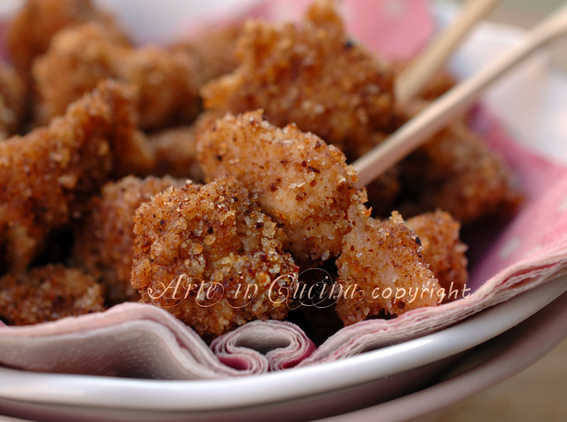 Tagliate le fettine in pezzeti di 1 cm x 1cm passateli nella farina poi negli albumi poi ripetete l’operazione e infine nel pane grattugiato.