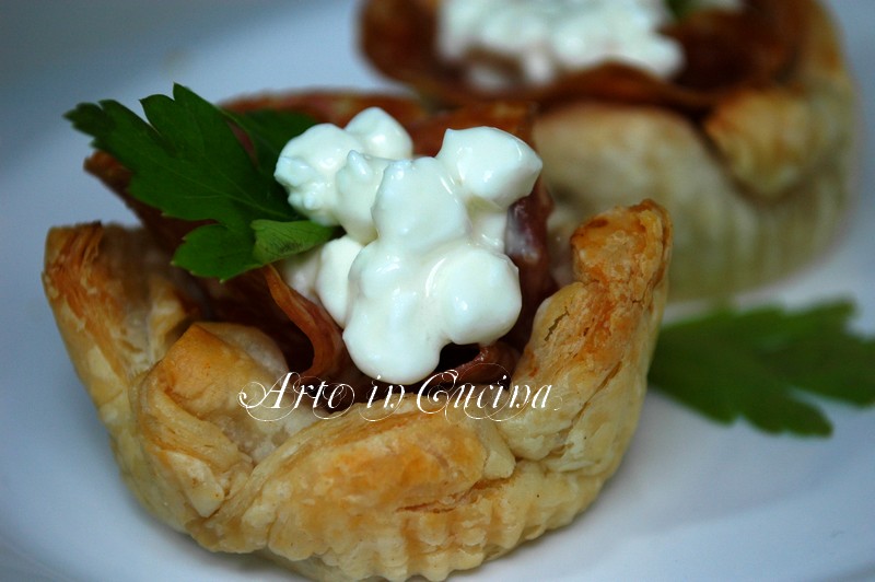Tagliate la sfoglia in tanti rettangoli i miei sono di circa 5 cm per 7cm, sistemateli negli stampi per muffin e cuocete a 200° circa 15 minuti.