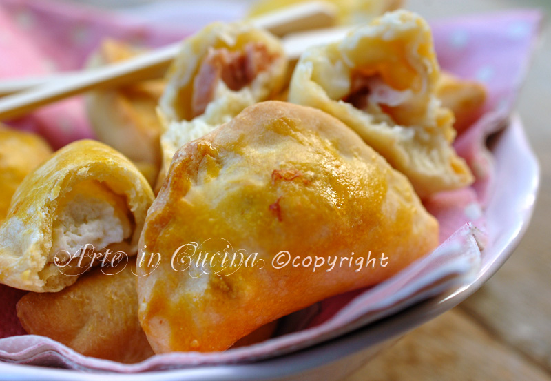 Ritagliate dei cerchi di circa 8-10cm, sistemate al centro di ogni cerchio il ripieno e poi sigillare a mo’ di barchetta, pizzicando con le dita la pasta.