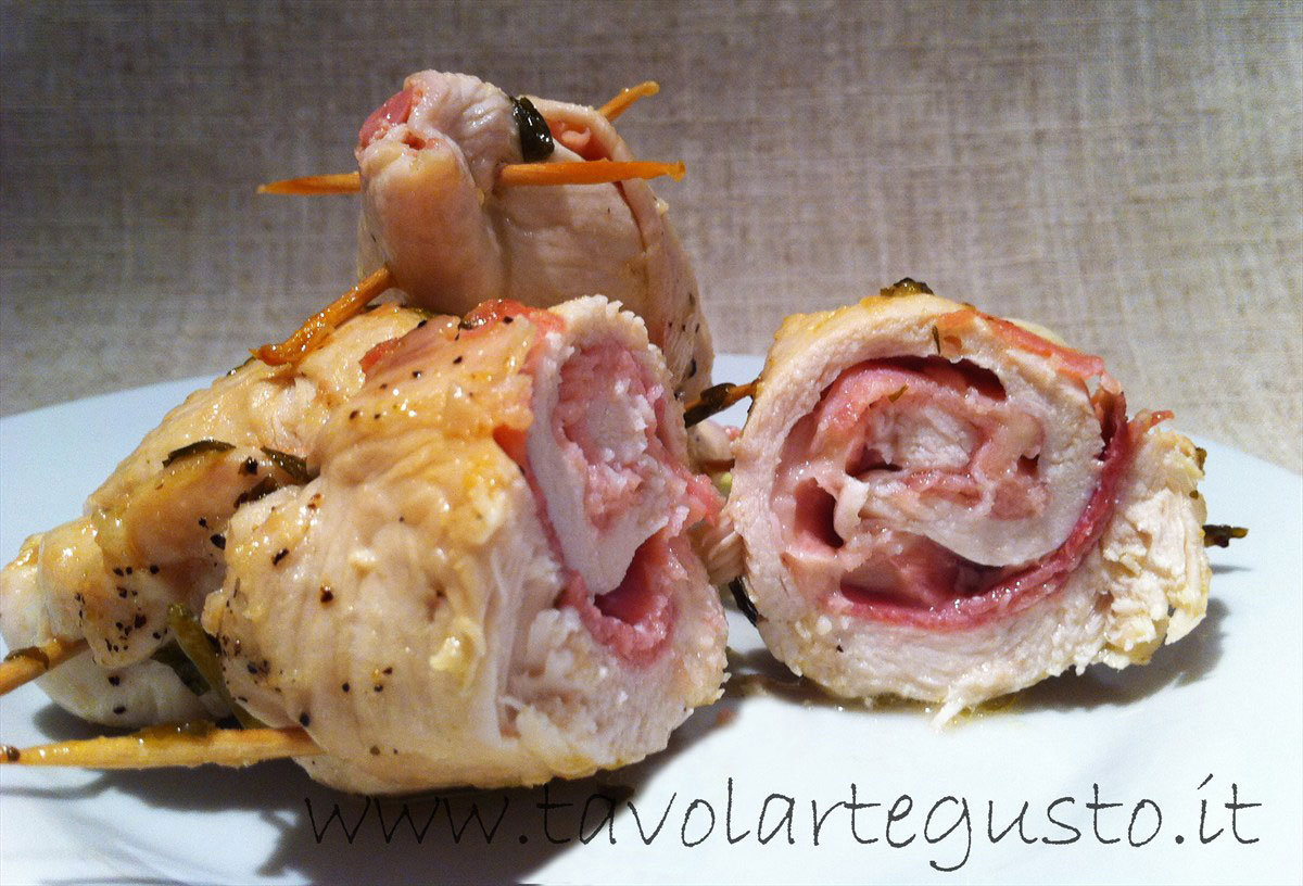 Prendete una fetta di pollo e farcitela prima con il formaggio e poi con lo speck, poi arrotolate la fetta su sé stessa, tagliate a fettine il rotolo ricavando così dei rotolini che andrete a fermare con uno spiedino di legno .