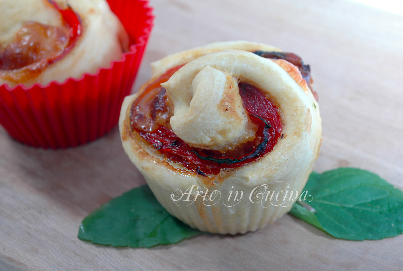 Adagiate su ogni striscia una fetta di peperone, fettine di scamorza, poi fate tanti rotolini e con la punta delle forbici fate dei piccoli tagli nella parte superiore in modo da aprire un po’ la sfoglia come fosse una rosa, potete vedere un passo passo come realizzare la torta di rose salata QUI