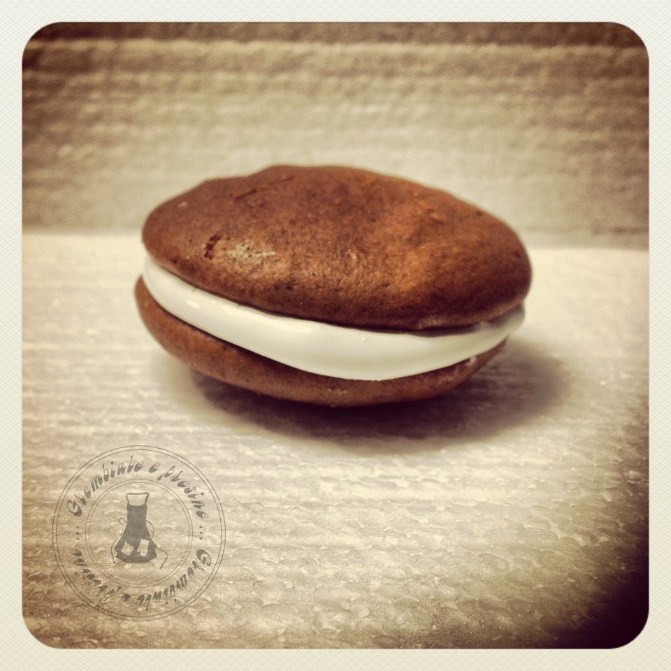 La crema dei whoopie deve risultare densa, liscia e lucida. Trasferitela in una sacca da pasticcere con bocchetta liscia e spremete la crema sulla parte piatta di un biscottino e coprite con la parte piatta di un altro biscottino. Continuate così fino a terminare gli ingredienti.