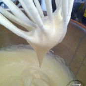 1. In una ciotola (o nella bowl della planetaria) , inserisco uova + zucchero e inizio a montare (se in planetaria uso la frusta a velocità alta). Il risultato che devo ottenere è una massa montata che è almeno 4 volte rispetto alla massa iniziale, deve essere di colore chiaro e, dalla frusta, quando la si solleva dalla montatura, deve rimanere come un “becco di uccello”, da li si vede se la montatura è finita o se si deve continuare ancora un po’.