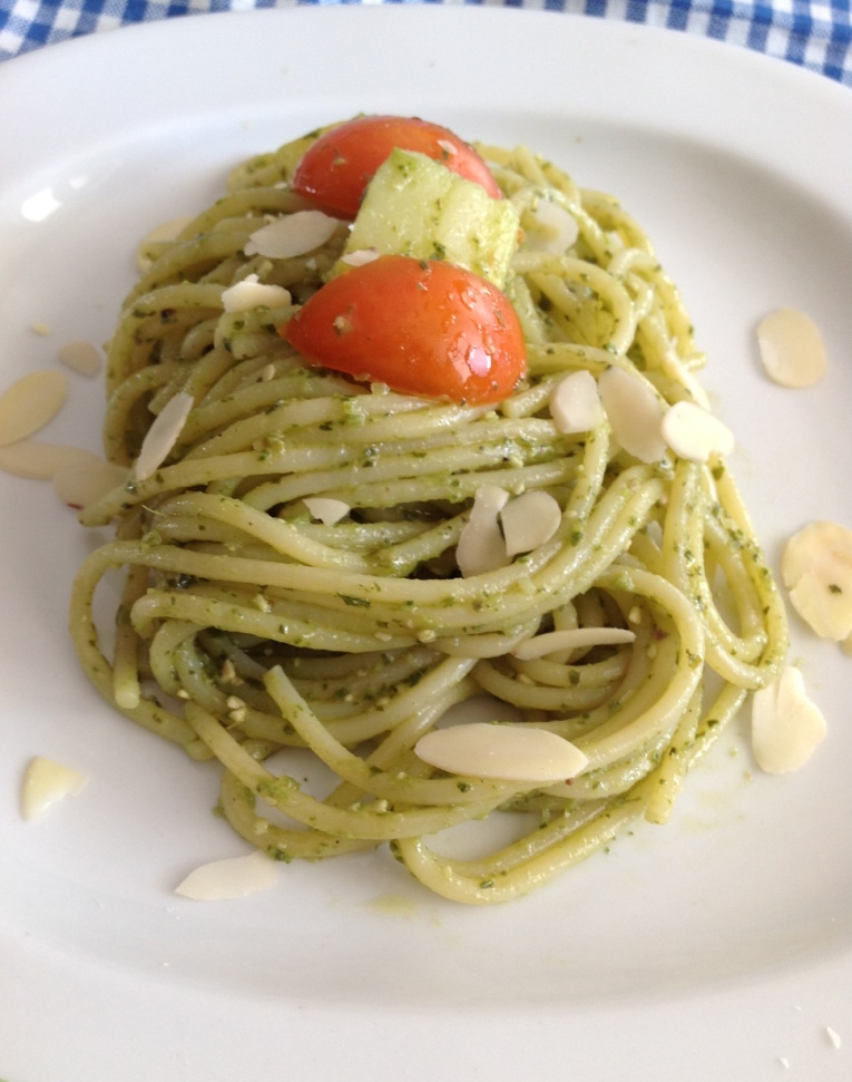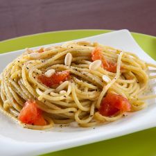 Lavate e asciugate salvia,timo e rosmarino.Poi mettete in padella le erbe aromatiche con lo scalogno e l'olio. Fate soffriggere e aggiungete mezzo bicchiere di vino rosso .Fate evaporare e unite i pomodori secchi. Qundo il tutto si è amalgamato passate gli ingredienti con il frullatore. Fate cuocere gli spaghetti e condite con questo pesto particolare.Servite