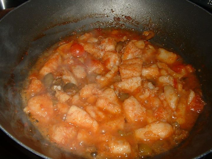 - 400 gr. di Filetti di Platessa, Pomodorini Qb, Concentrato di Pomodoro Qb, Basilico, Acqua, Olio, 1 Cipollotto, Olive.