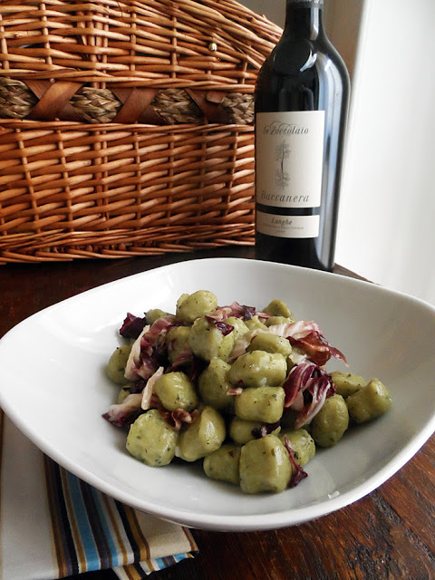 Confezionare i classici gnocchi e nel frattempo portare a bollore l'acqua. Calare gli gnocchi, scolandoli appena vengono a galla e condirli con il radicchio tagliato a strisce fatto rosolare pochi minuti nel burro.
